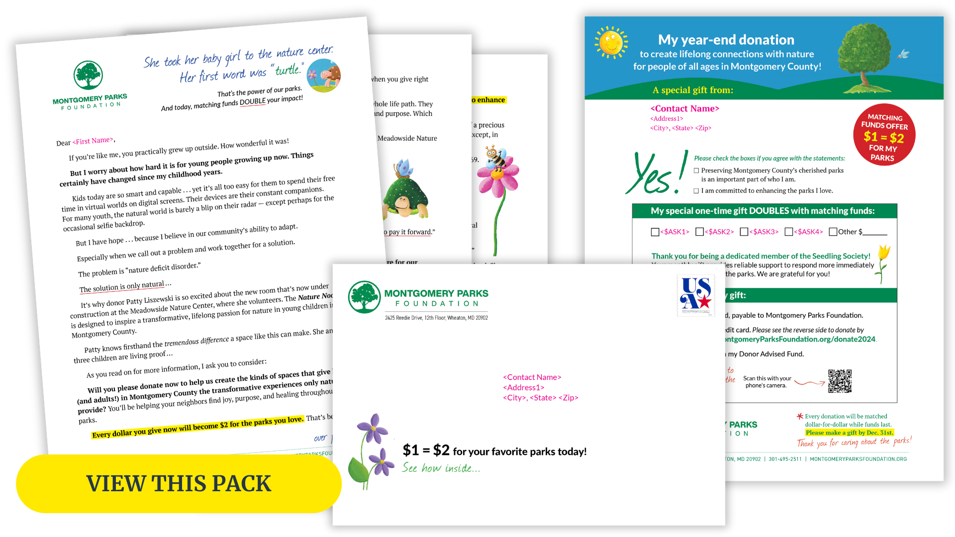 This appeal letter, which we wrote and designed, highlights the need to preserve and enhance Montgomery County's parks in an era when children are increasingly disconnected from nature. It shares powerful personal stories. A mother's daughter spoke her first word — "turtle" — at a nature center. A young visitor to local gardens grew up to become their director.